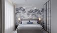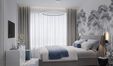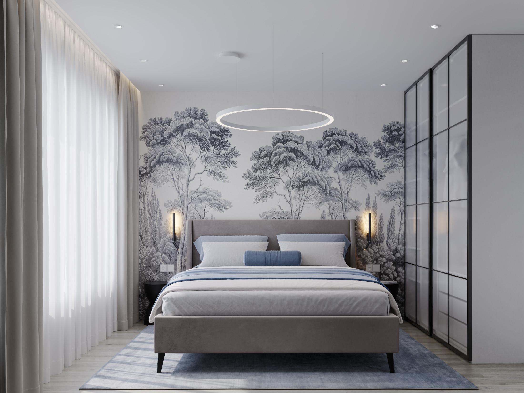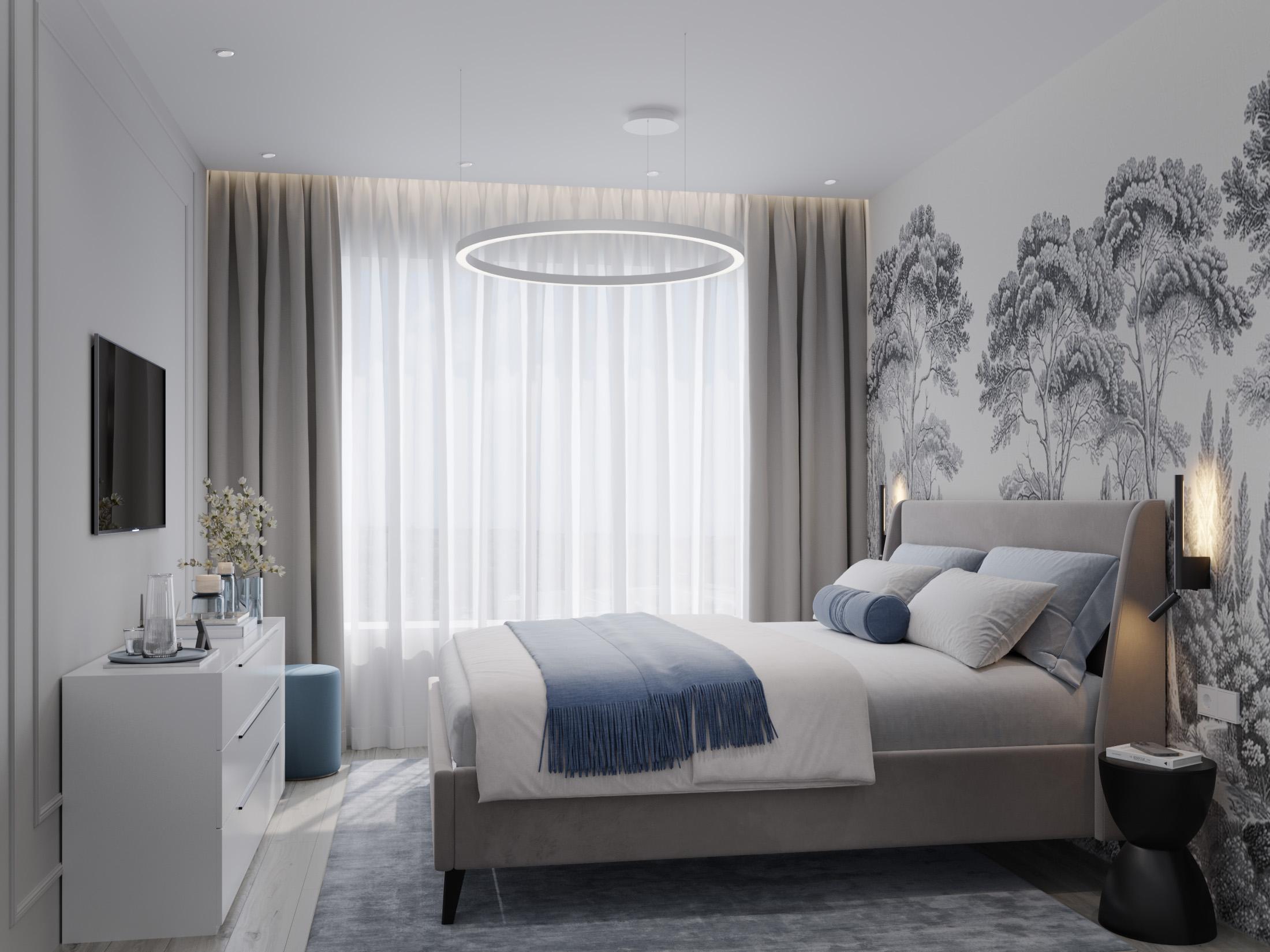 * Стильно оформленная спальня с большой кроватью.