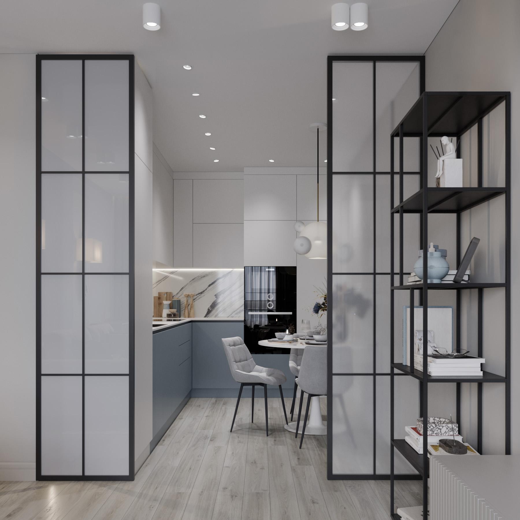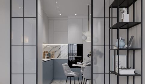 * Эффектный кухонный гарнитур со встроенной техникой (духовой шкаф, посудомоечная машина), мягкое освещение над столешницей и возле обеденного стола.